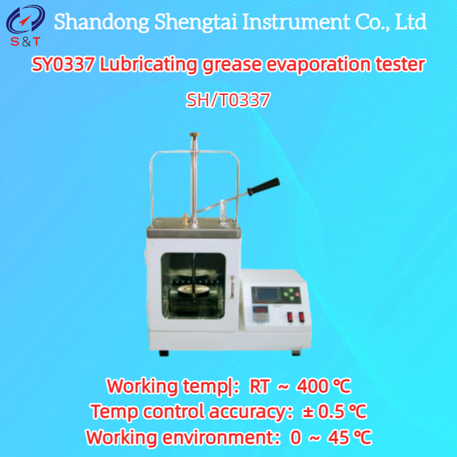 SY0337 Verdampingstester voor smeervet Dit instrument is ontworpen en vervaardigd in overeenstemming met de SH/T0337-standaard en is geschikt voor het meten van de verdamping van smeervet. Plaats een verdampingsschaal gevuld met 1 mm dik smeervet in een gespecialiseerde thermostaat en houd deze gedurende 1 uur (of zoals gespecificeerd in de productstandaard voor smeervet) op de gespecificeerde temperatuur om het massaverlies te meten.