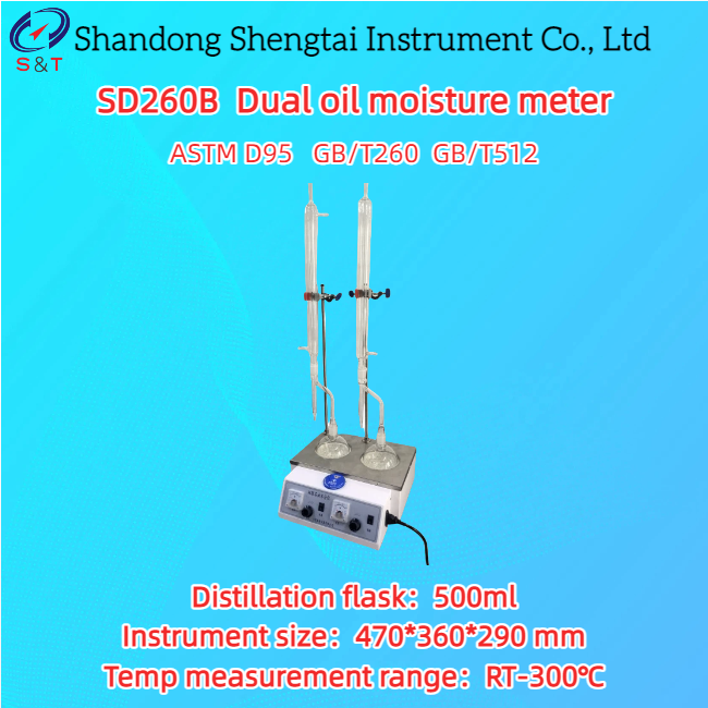 The SD260B petroleum moisture meter is designed and manufactured in accordance with the requirements of the Chinese standard GB/T 260 "Method for Determination of Moisture in Petroleum Products". It complies with GB/T 2288-2008 "Method for Determination of Moisture in Coking Products - First Distillation Method" and the requirements of G/JBJD6 "Technical Conditions for Petroleum Product Moisture Testers". This instrument is suitable for determining the moisture content in petroleum products according to the test methods specified in GB/T 260 standard, and is also suitable for determining the moisture content in lubricating grease according to the test methods specified in GB/T 512 "Lubricating grease moisture determination method". Complies with ASTM D95.