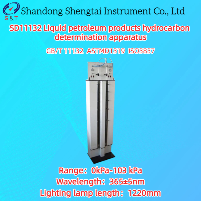 De SD11132 meter voor koolwaterstoffen in vloeibare aardolieproducten voldoet aan de Chinese nationale standaard GB/T 11132-2002 "Bepalingsmethode voor koolwaterstofvloeibare aardolieproducten (fluorescerende indicator adsorptiemethode)" en is ontworpen en vervaardigd volgens de daarin vastgelegde eisen. Het apparaat is van toepassing op de bepaling, zoals vastgelegd in de standaard GB/T 11132, van de belangrijkste koolwaterstoffen in vloeibare aardolieproducten met behulp van een fluorescerende indicator die wordt weergegeven op een silicagel-adsorptiekolom, om het volumeprocent te berekenen, als kwaliteitsindicator voor brandstoffen zoals motorbrandstof en luchtvaartbrandstof.