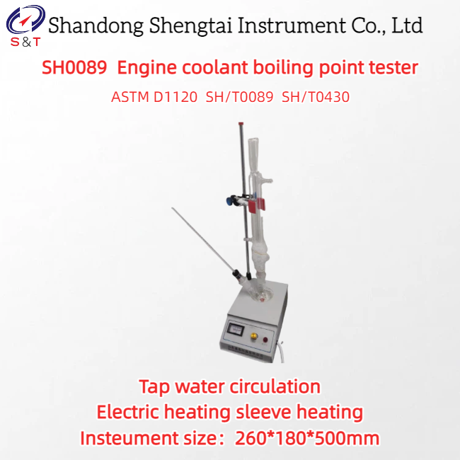 De SH0089 tester voor het kookpunt van koelvloeistof wordt gebruikt om het evenwichtskookpunt van koelvloeistof te meten, geschikt voor het meten van verdunde of geconcentreerde koelvloeistof. Toepasselijke normen: ASTM D1120 SH/T0089 "Kookpunt van koelvloeistof" of SH/T0430 "Bepaling van het evenwichtsrefluxkookpunt van remvloeistof"